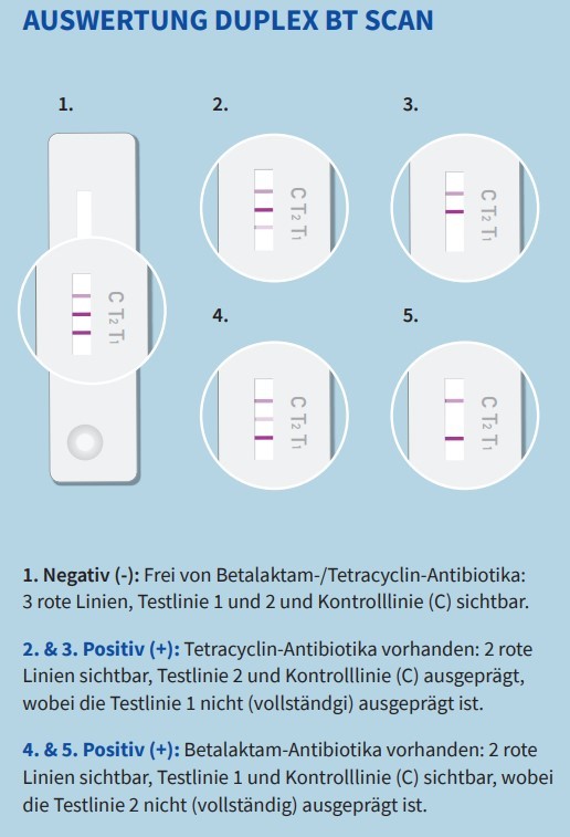 Der DUPLEX BT Scan ist ein Schnelltest zum Nachweis aller gängigen in der Behandlung von Eutern genutzten Beta-Laktam- und Tetracyclin-Antibiotika, wie sie typischerweise bei Euterbehandlungen eingesetzt werden.